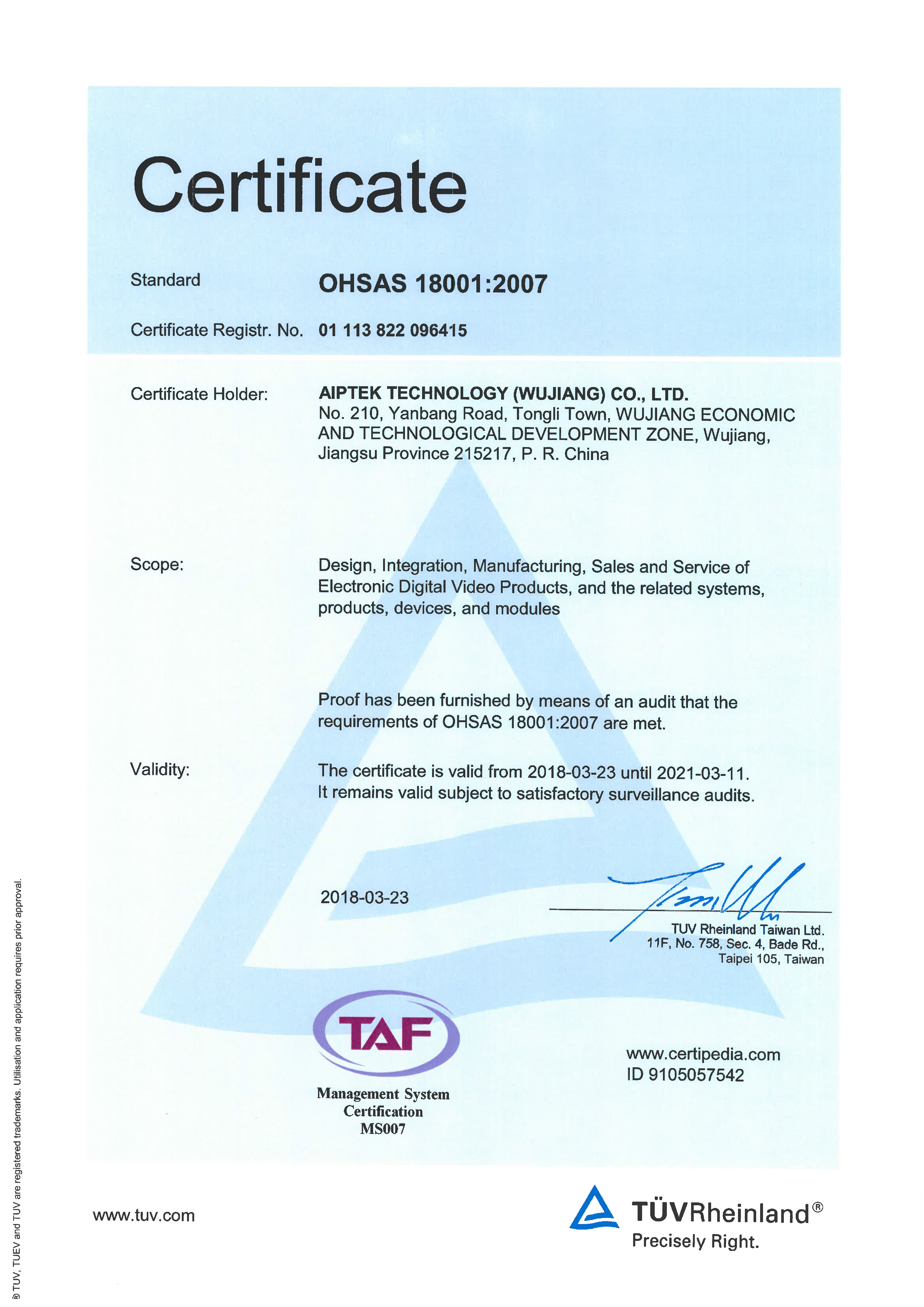 OHSAS 18001, "Occupational Health and Safety Assessment Series", is the British occupational health and safety management system standard. Compliance with it enables companies to demonstrate that they have a system in place for occupational health and safety.